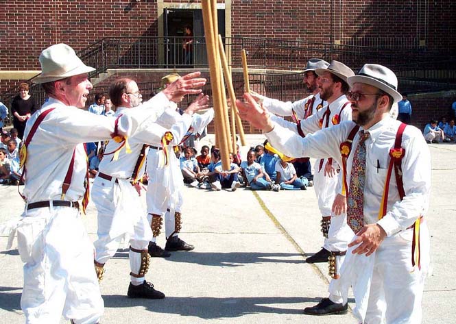be plentiful to the folk who worshipped them. Kingsessing Morris Men springs from Philadelphia and the surrounding areas from where it began in 1977. The team's dancing was originally done in the springtime with vigor, in the hopes that the planting season will be bountiful, and that those who view the dance will have good fortune. Bells are worn on the knees to wake the ground. Through the years the dancing has evolved into a year long tradition, dancing for any festive occasion that could bring enjoyment |